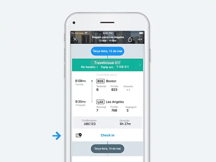 Estamos no século 21, então é claro que você vai fazer seu check-in online. Mas mesmo assim, lembrar ou digitar um número de confirmação estranho (ou ter que instalar um aplicativo para cada companhia aérea) pode ser frustrante. Ao invés disso, você pode fazer o check-in diretamente pelo aplicativo do KAYAK. Nós te avisamos quando o check-in abrir, te direcionamos para o site da companhia aérea, preenchemos seus dados de acordo com sua reserva e iniciamos o check-in. Assim, você só precisará se preocupar em escolher o melhor assento na cabine.